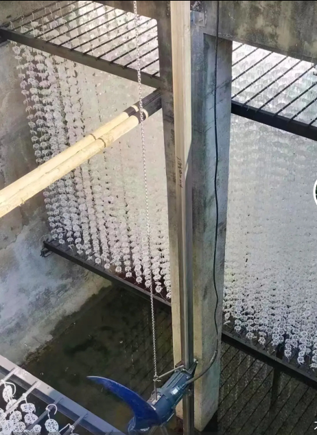 杜安環(huán)保潛水推流器安裝系統(tǒng)主要由手拉葫蘆、起吊架、吊架座、起吊環(huán)鏈、導(dǎo)桿、限位架、底座等組成。低速推流器通過(guò)導(dǎo)輪沿導(dǎo)桿上下移動(dòng),起吊架安裝在起吊架座上并可繞其定位軸線旋轉(zhuǎn)360°,以方便安裝及維護(hù)本安裝系統(tǒng)的限位架為“T"子形,上端與低速推流器體接觸,橫向用螺栓與導(dǎo)桿聯(lián)板聯(lián)接(導(dǎo)桿聯(lián)板待低速推流器位置調(diào)整正確后焊在導(dǎo)桿上),下端用膨脹螺栓固定。為增加低速推流器運(yùn)行時(shí)的可靠性,減緩潛低速推流器運(yùn)行中的振動(dòng),在低速推流器與限位架加設(shè)V形橡膠減震塊。